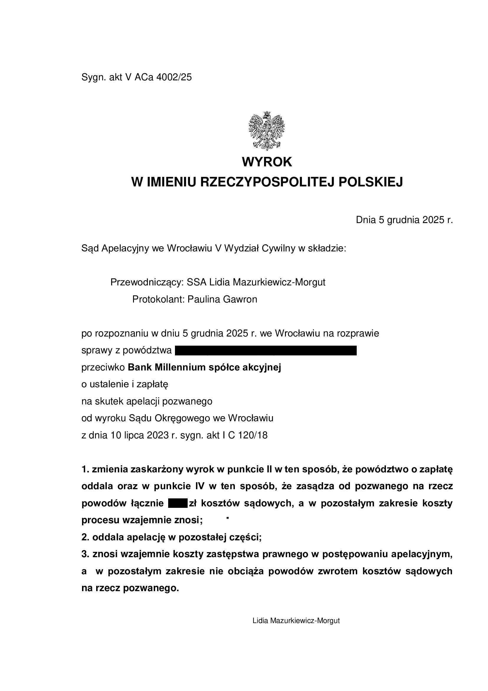 Wyrokiem z dnia 5.12.2025 r. Sąd Apelacyjny we Wrocławiu I Wydział Cywilny (SSA Lidia Mazurkiewicz – Morgut), w sprawie o sygn. akt V ACa 4002/25 (wcześniej: I ACa 2786/23), oddalił apelację banku w zakresie ustalenia nieważności i zmienił wyrok Sądu I instancji w zakresie zasądzenia i oddalił powództwo stosując tzw. saldo.