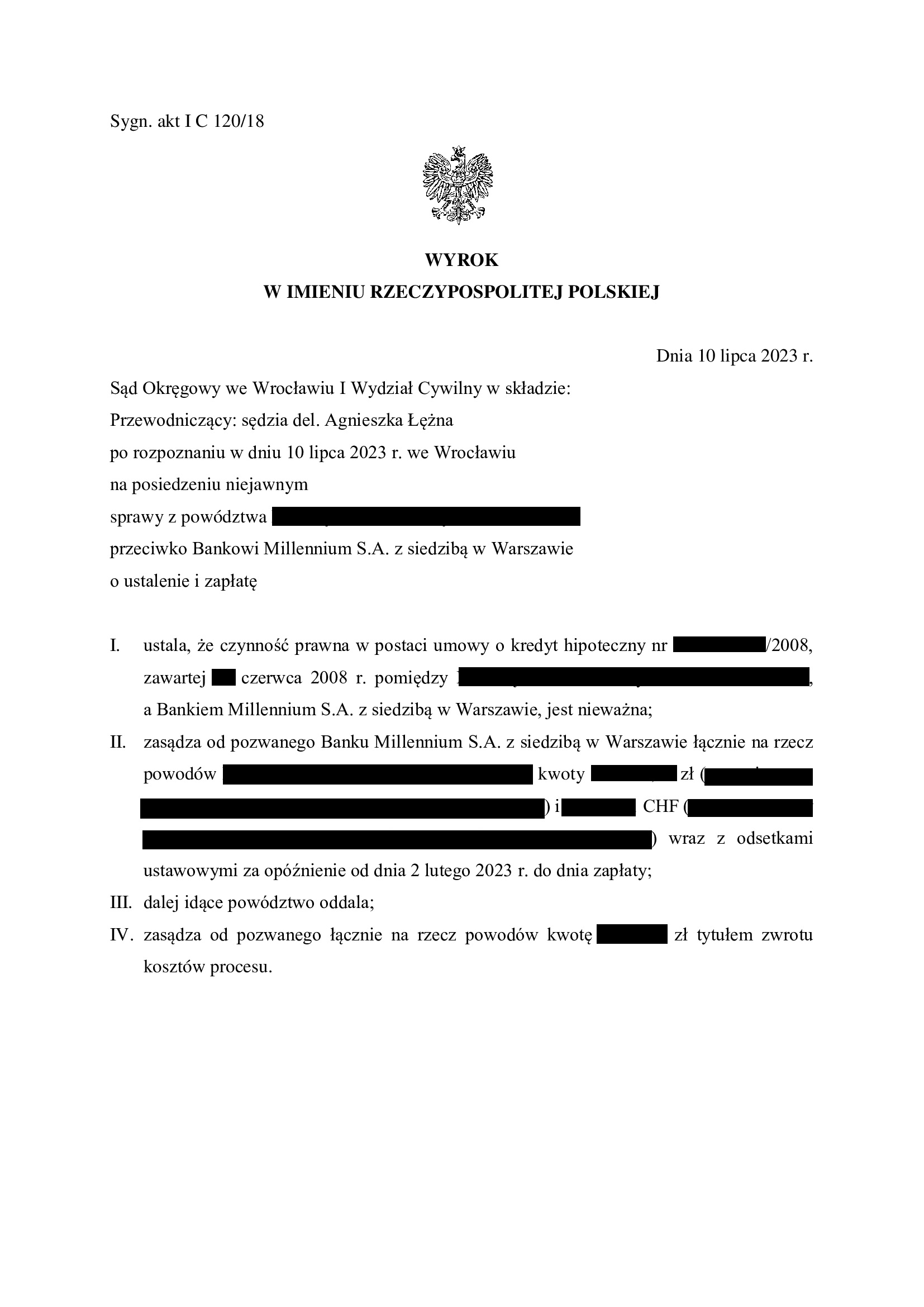 Wyrokiem z dnia 30.07.2025 r. Sąd Okręgowy we Wrocławiu (SSO Izabela Cieślińska), wydanym w sprawie o sygn. akt XII C 684/22, ustalił nieważność umowy kredytu indeksowanego do CHF zawartej z Bankiem Millennium oraz zasądził od banku na rzecz Klientów Kancelarii zwrot wpłaconych bankowi środków, jako nienależnych wraz z odsetkami od dnia wezwania. Zasądzona kwota stanowi nadwyżkę po potrąceniu kapitału kredytu dokonanym przed złożeniem pozwu. Bank został obciążony kosztami procesu.