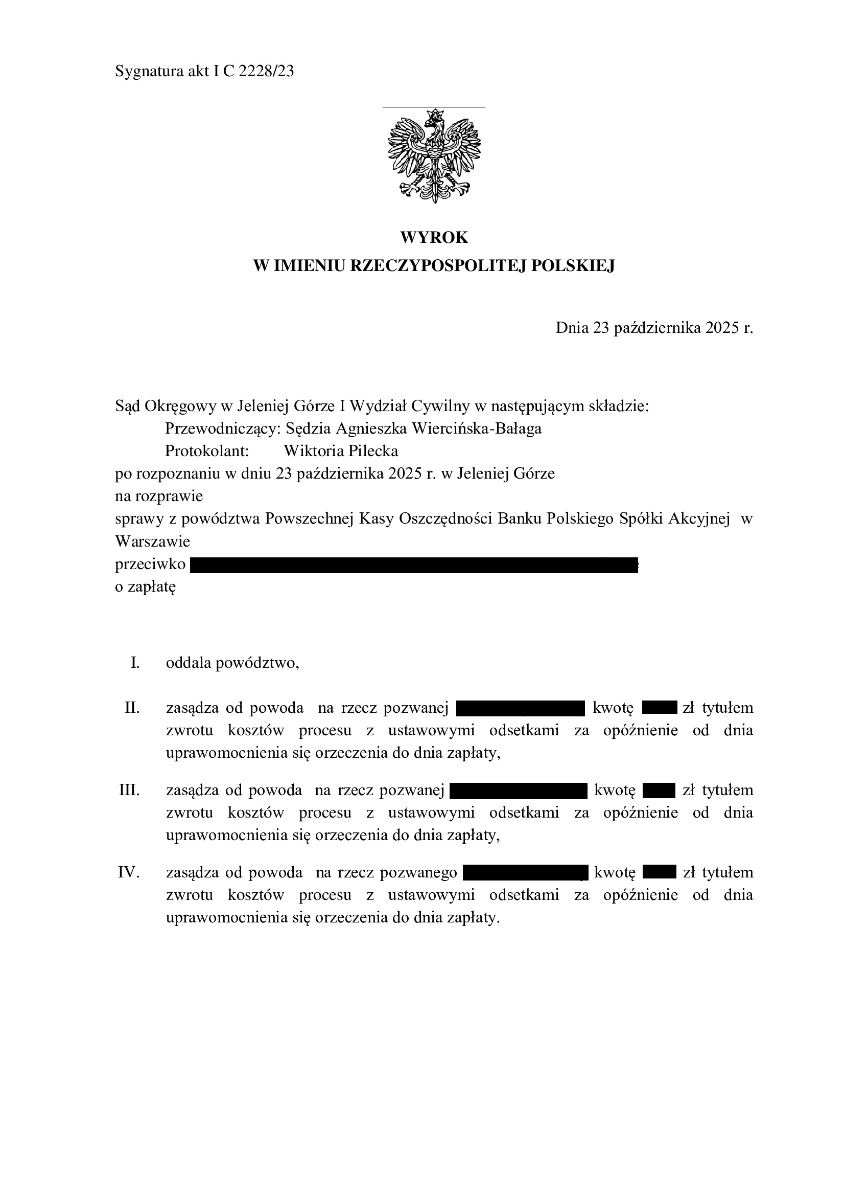Wyrokiem z dnia 23.10.2025 r., Sąd Okręgowy w Jeleniej Górze (SSO Agnieszka Wiercińska – Bałaga), w sprawie o sygn. akt I C 2228/23 oddalił pozew PKO BP o zapłatę skapitalizowanych odsetek za czas od wezwania do czasu potrącenia kapitału kredytu przez kredytobiorców. Nadto, Sąd umorzył postępowanie w zakresie cofniętego pozwu – o zapłatę kapitału kredytu i wynagrodzenia za korzystanie z kapitału kredytu / waloryzację oraz obciążył bank kosztami procesu na rzecz każdego z pozwanych.