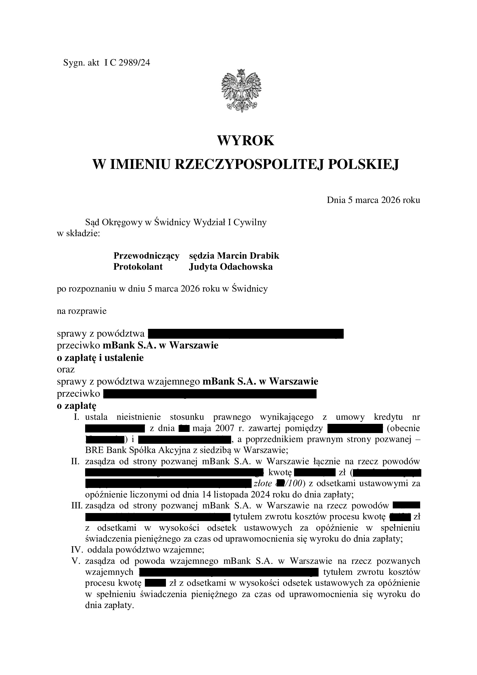 Wyrokiem z dnia 15.01.2026 r., Sąd Okręgowy w Świdnicy (SSO Maja Sawicz), w sprawie o sygn. akt I C 2374/23 oddalił pozew mBank o zapłatę skapitalizowanych odsetek naliczonych od kapitału kredytu, umorzył postępowanie w zakresie cofniętego pozwu oraz obciążył bank kosztami procesu.