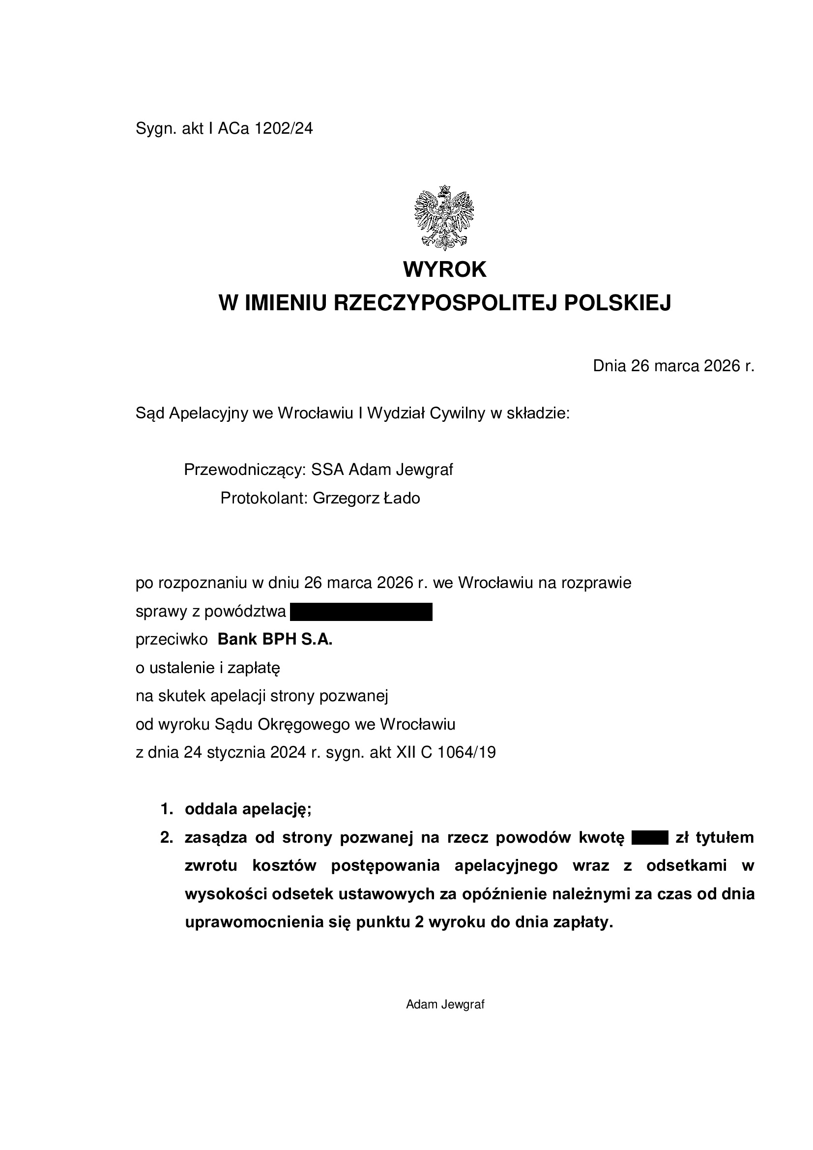 Apelacja banku została w całości oddalona wyrokiem Sądu Apelacyjnego we Wrocławiu z dnia 26.03.2026 r., sygn. I ACa 1202/24.