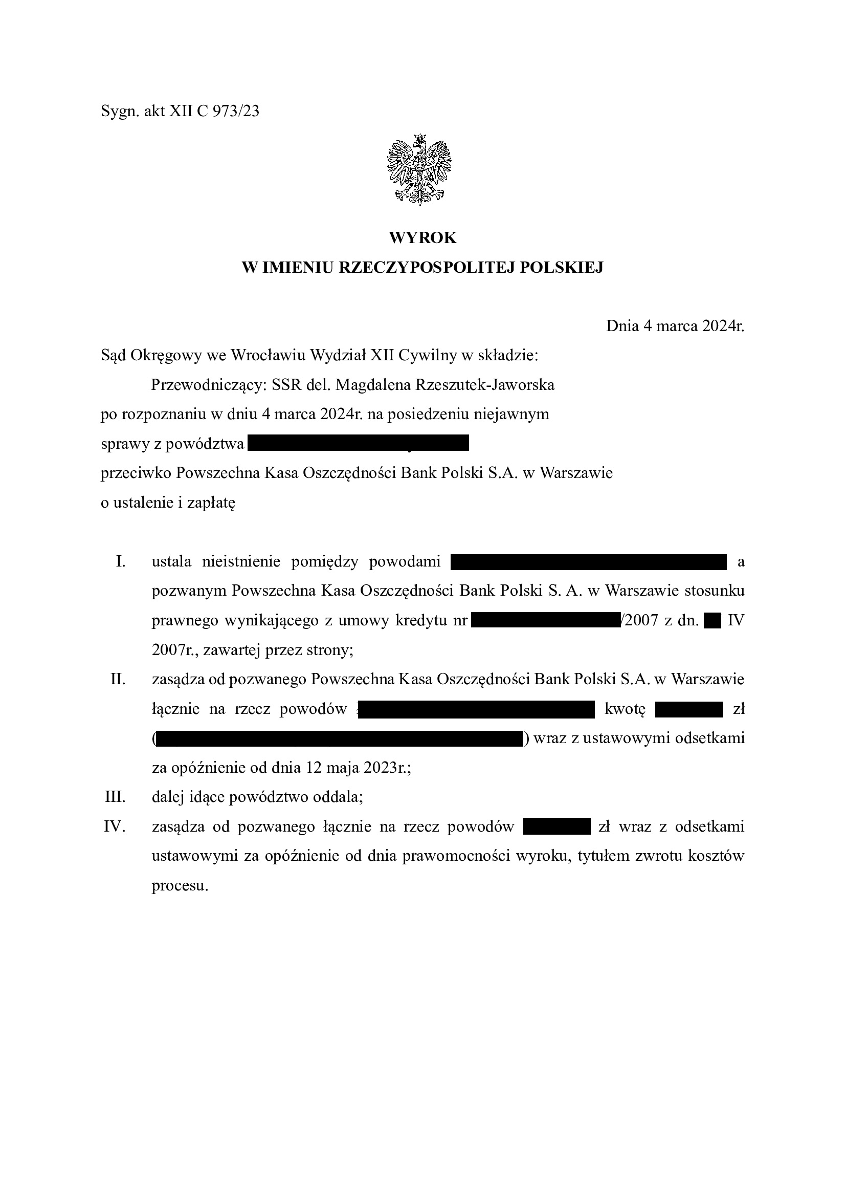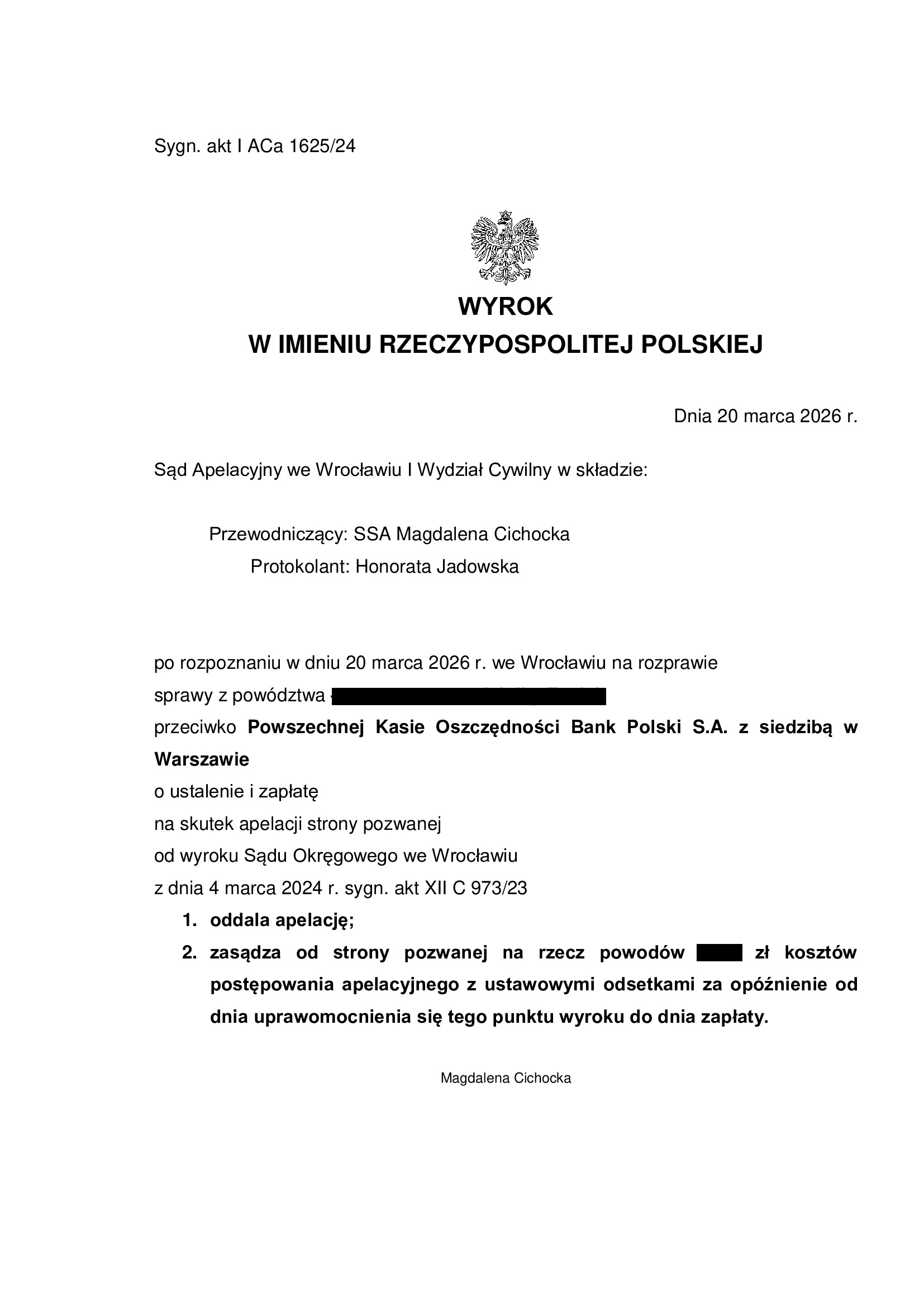 Wyrokiem z dnia 20.03.2026 r., Sąd Apelacyjny we Wrocławiu i Wydział Cywilny (SSA Magdalena Cichocka), w sprawie o sygn. akt I ACa 1625/24, oddalił w całości apelację banku. Bank został obciążony kosztami postępowania apelacyjnego.