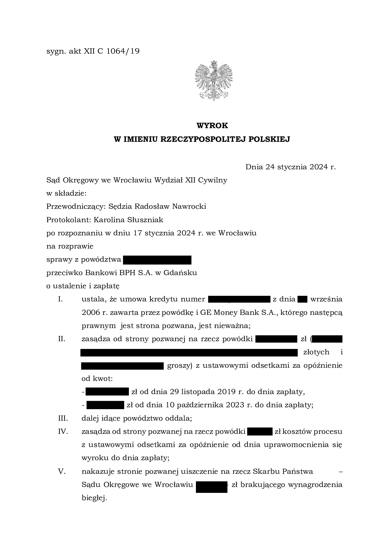 Wyrokiem z dnia 26.03.2026 r. Sąd Apelacyjny we Wrocławiu I Wydział Cywilny (SSA Adam Jewgraf), w sprawie o sygn. akt I ACa 1202/24 oddalił w całości apelację banku. Bank został obciążony kosztami postępowania apelacyjnego.