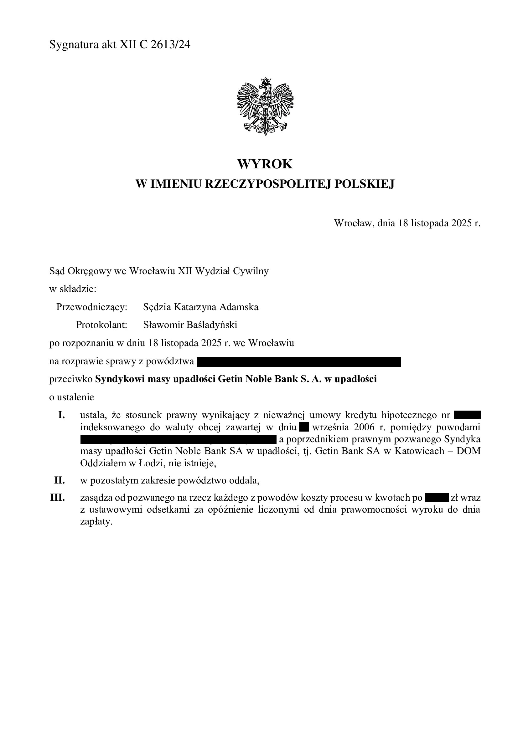 Wyrokiem z dnia 18.11.2025 r., Sąd Okręgowy we Wrocławiu (SSO Katarzyna Adamska), w sprawie o sygn. akt XII C 2613/24 (wcześniej: XII C 1098/23), ustalił nieistnienie z powodu nieważności umowy kredytu indeksowanego do CHF zawartej we wrześniu 2006 r. z dawnym Getin Bank S.A. DOM Oddział w Łodzi i obciążył syndyka kosztami procesu.
