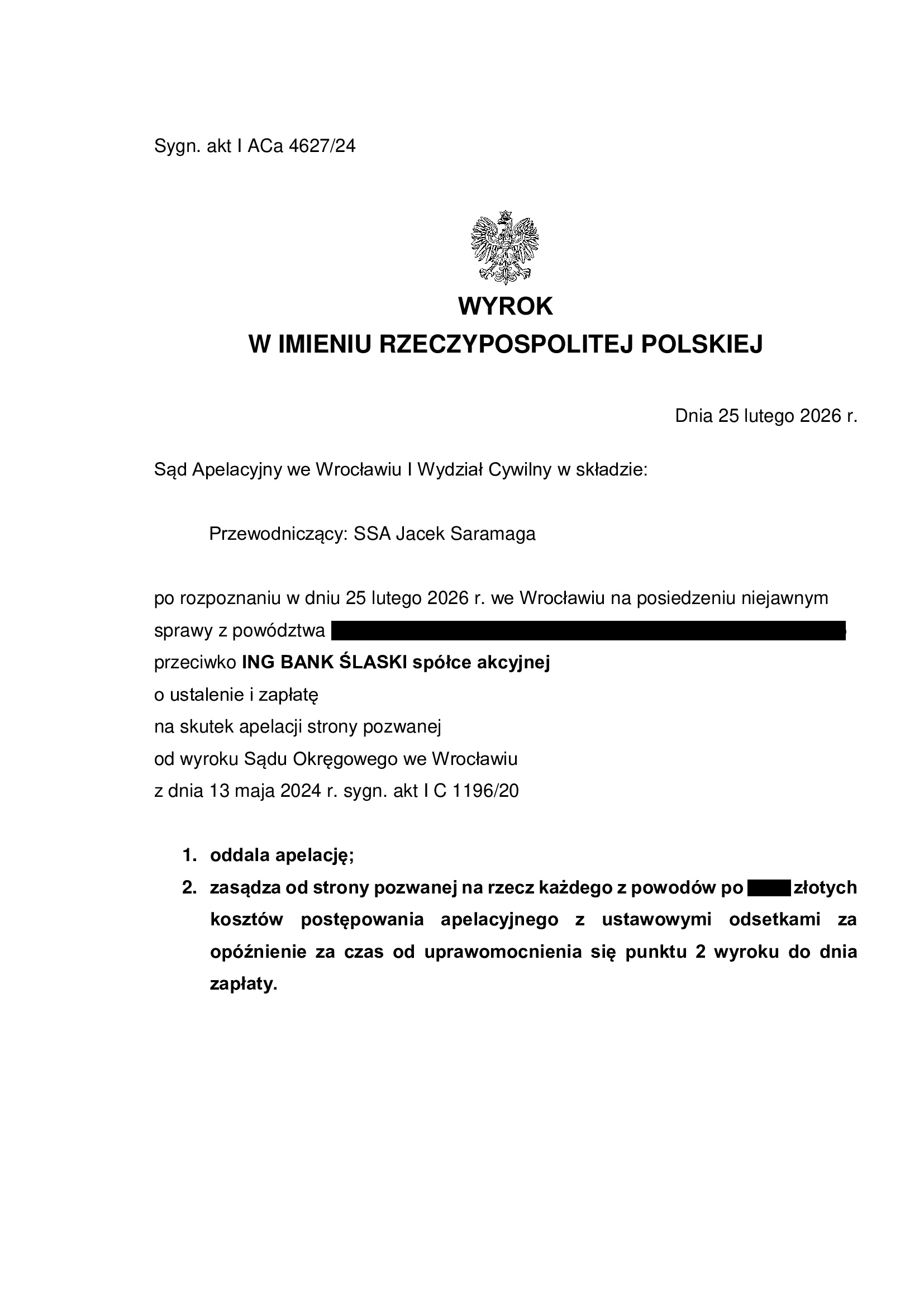 Wyrokiem z dnia 26.03.2026 r. Sąd Apelacyjny we Wrocławiu I Wydział Cywilny (SSA Adam Jewgraf), w sprawie o sygn. akt I ACa 1202/24 oddalił w całości apelację banku. Bank został obciążony kosztami postępowania apelacyjnego.