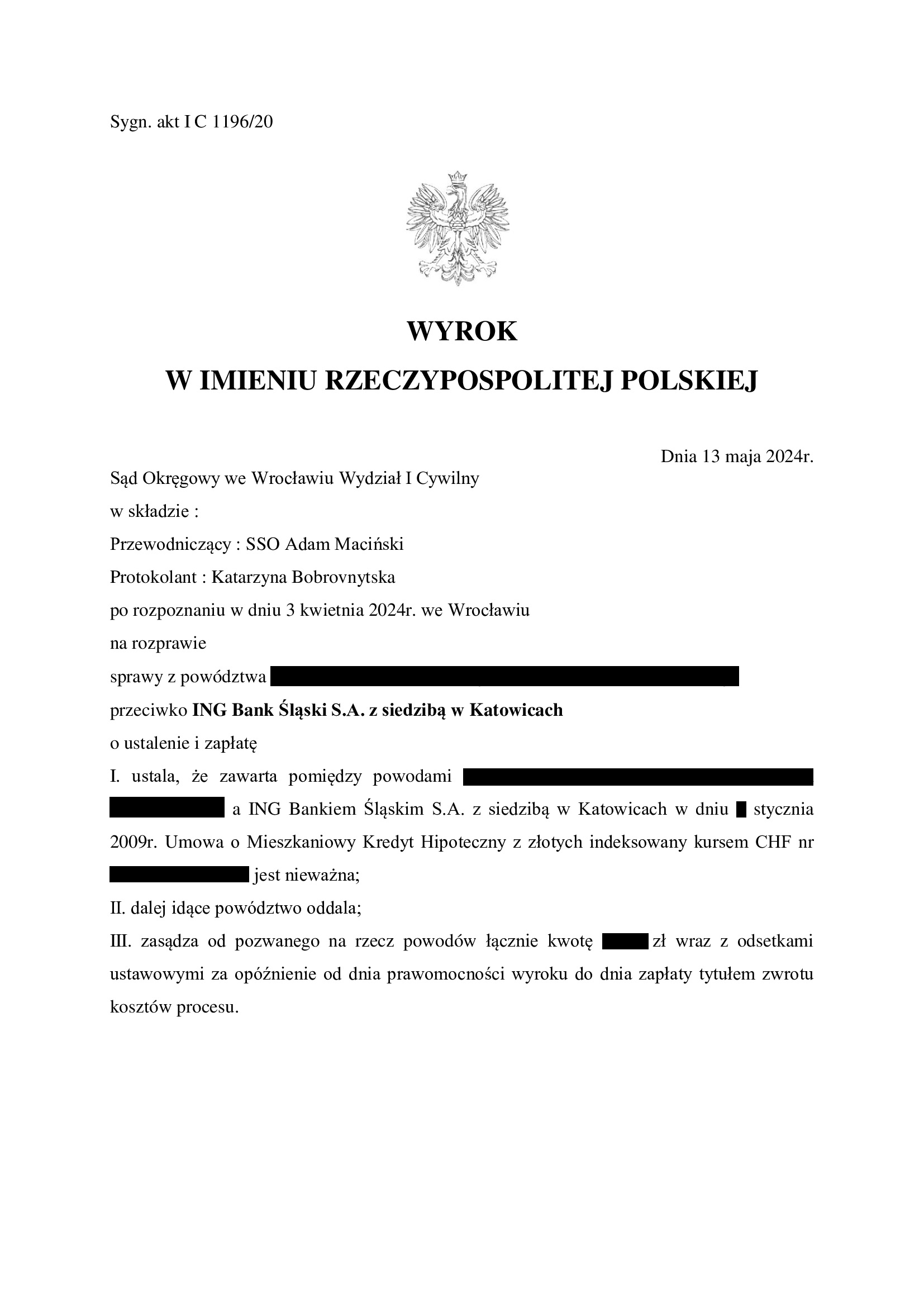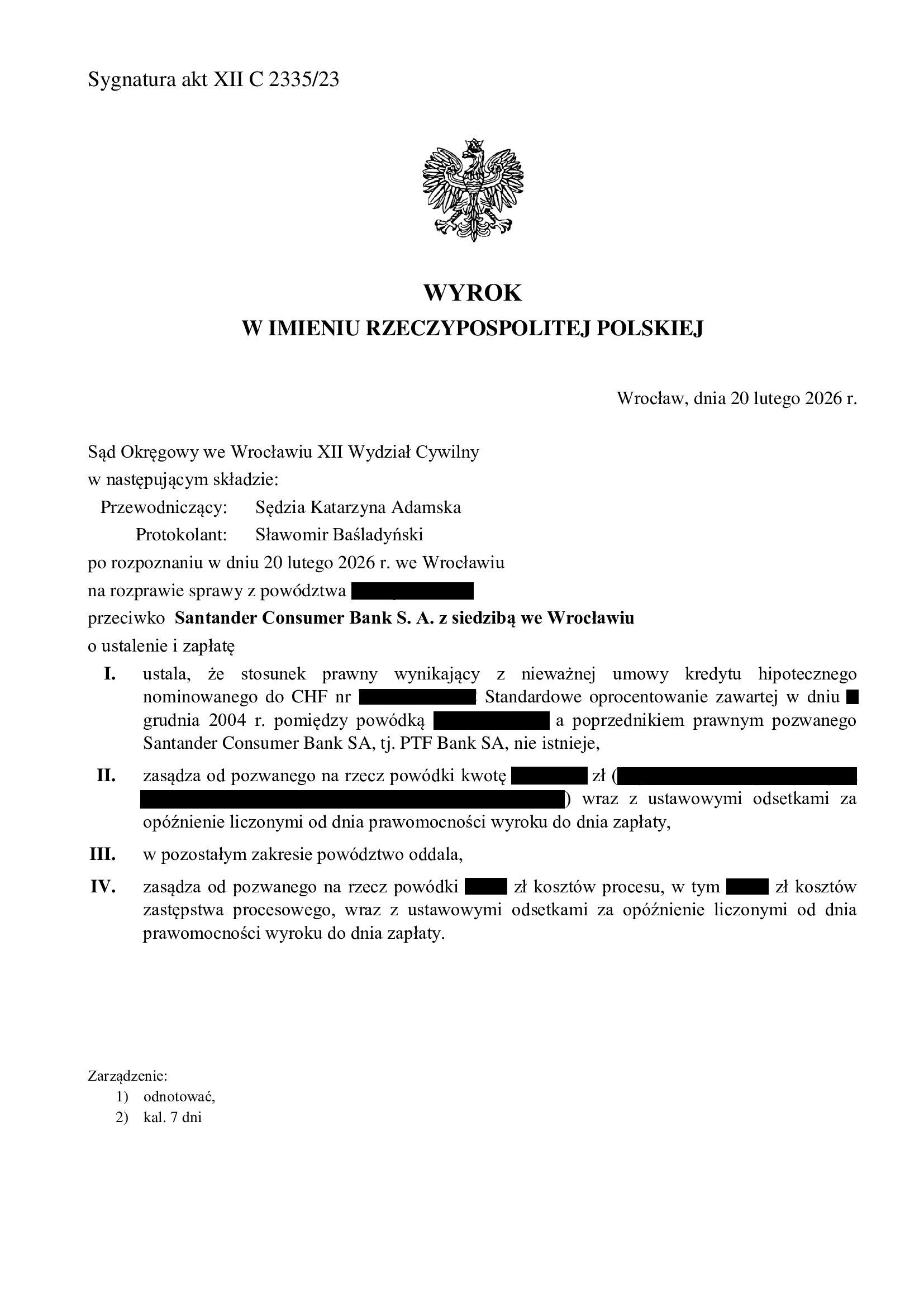 Wyrokiem z dnia 15.04.2026 r., Sąd Okręgowy we Wrocławiu (SSO Radosław Nawrocki), w sprawie o sygn. akt XII C 1709/23, przyjmując przesłankową nieważność umowy kredytu, zasądził dochodzoną kwotę wraz z odsetkami od dnia wezwania, stanowiącą nadwyżkę pozostałą po dokonanym potrąceniu kapitału kredytu.
