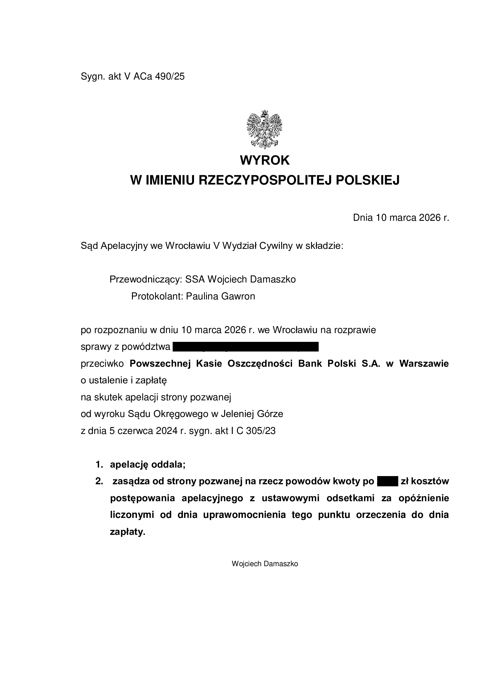 Wyrokiem z dnia 10.03.2026 r., Sąd Apelacyjny we Wrocławiu V Wydział Cywilny (SSA Wojciech Damaszko), w sprawie o sygn. akt V ACa 490/25 (wcześniej: I ACa 3202/24), oddalił w całości apelację banku. Bank został obciążony kosztami postępowania apelacyjnego.