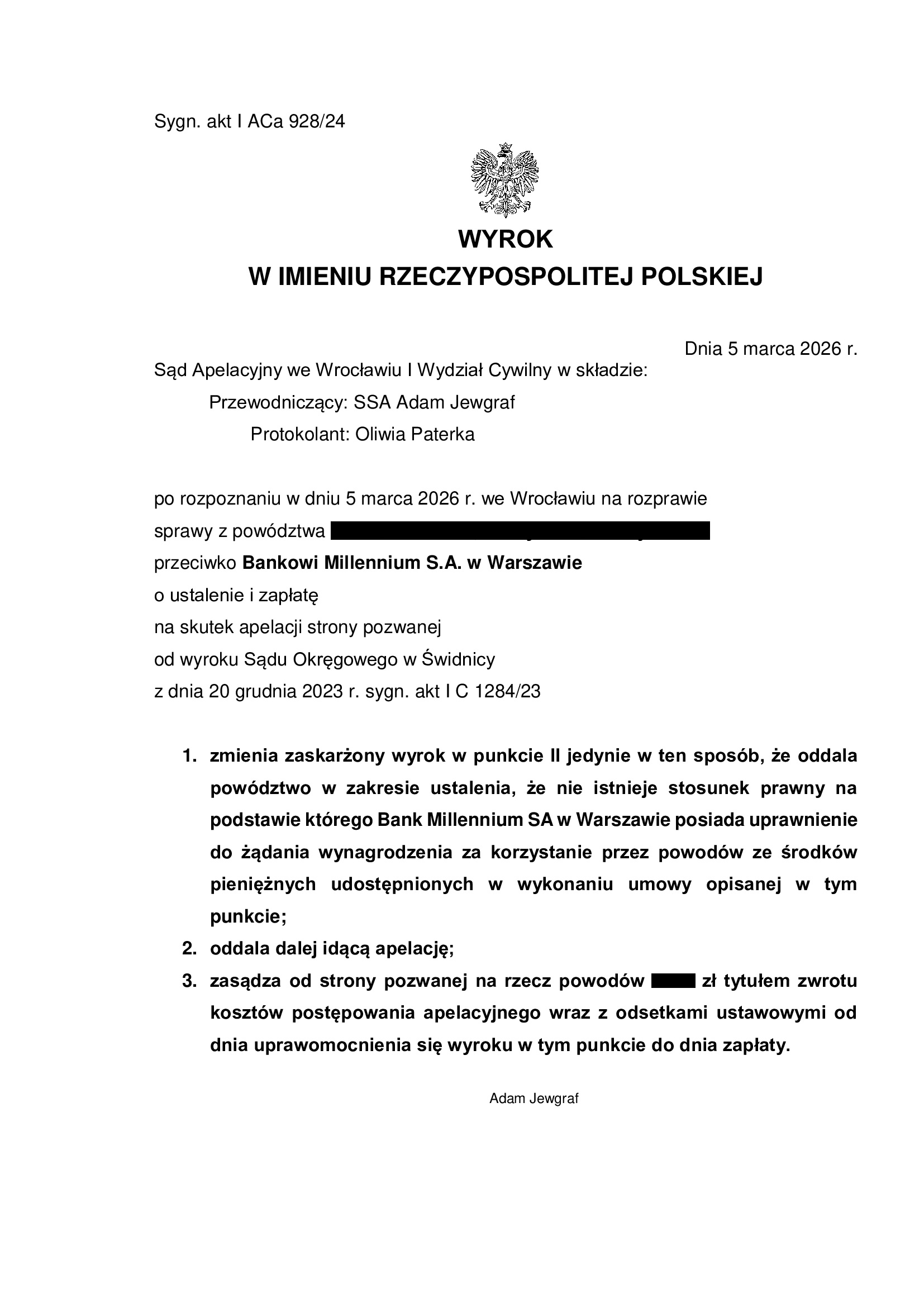Wyrokiem z dnia 5.03.2026 r., Sąd Apelacyjny we Wrocławiu I Wydział Cywilny (SSA Adam Jewgraf), w sprawie o sygn. akt I ACa 928/24, oddalił apelację banku w zakresie ustalenia nieważności umowy kredytu oraz zasądzenia oraz zmienił wyrok jedynie w ten sposób, że oddalił żądanie tzw. szerokiego ustalenia. Bank został obciążony kosztami postępowania apelacyjnego.