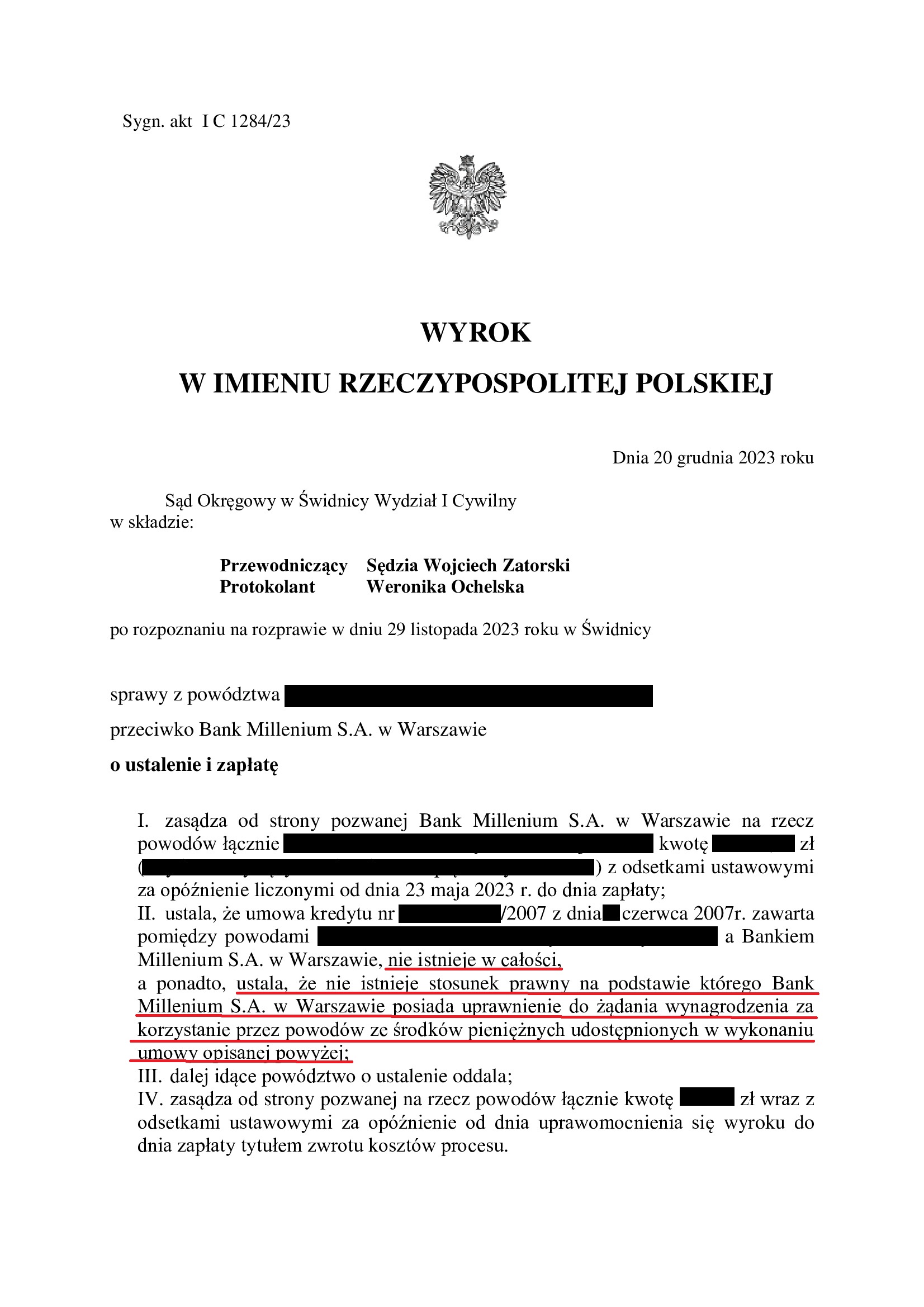 Apelacja złożona przez bank dotyczyła wyroku z dnia 20.12.2023 r., którym Sąd Okręgowy w Świdnicy (SSR del. Wojciech Zatorski), w sprawie o sygn. akt I C 1284/23 ustalił nieistnienie umowy kredytu indeksowanego zawartej w czerwcu 2007 r. z Bankiem Millennium oraz, że nie istnieje stosunek prawny na podstawie którego Bank Millenium S.A. w Warszawie posiada uprawnienie do żądania wynagrodzenia za korzystanie przez powodów ze środków pieniężnych udostępnionych w wykonaniu umowy.
