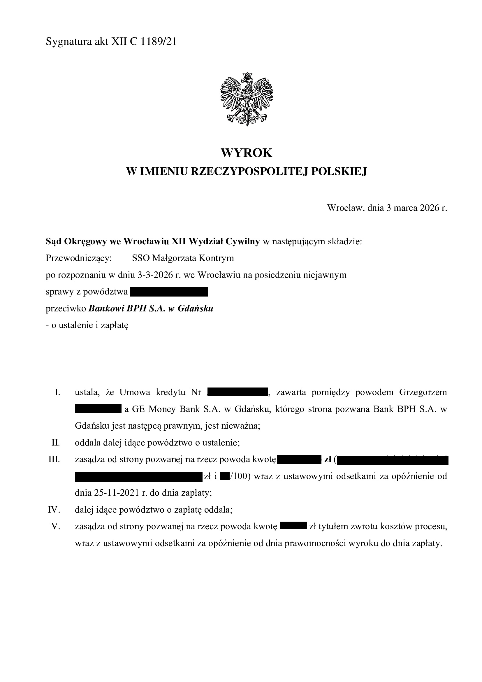 Nieważność umowy kredytu denominowanego z września 2006 r. dawnego GE Money Bank (aktualnie Bank BPH) - wyrok SO Wrocław z 3.03.2026 r.