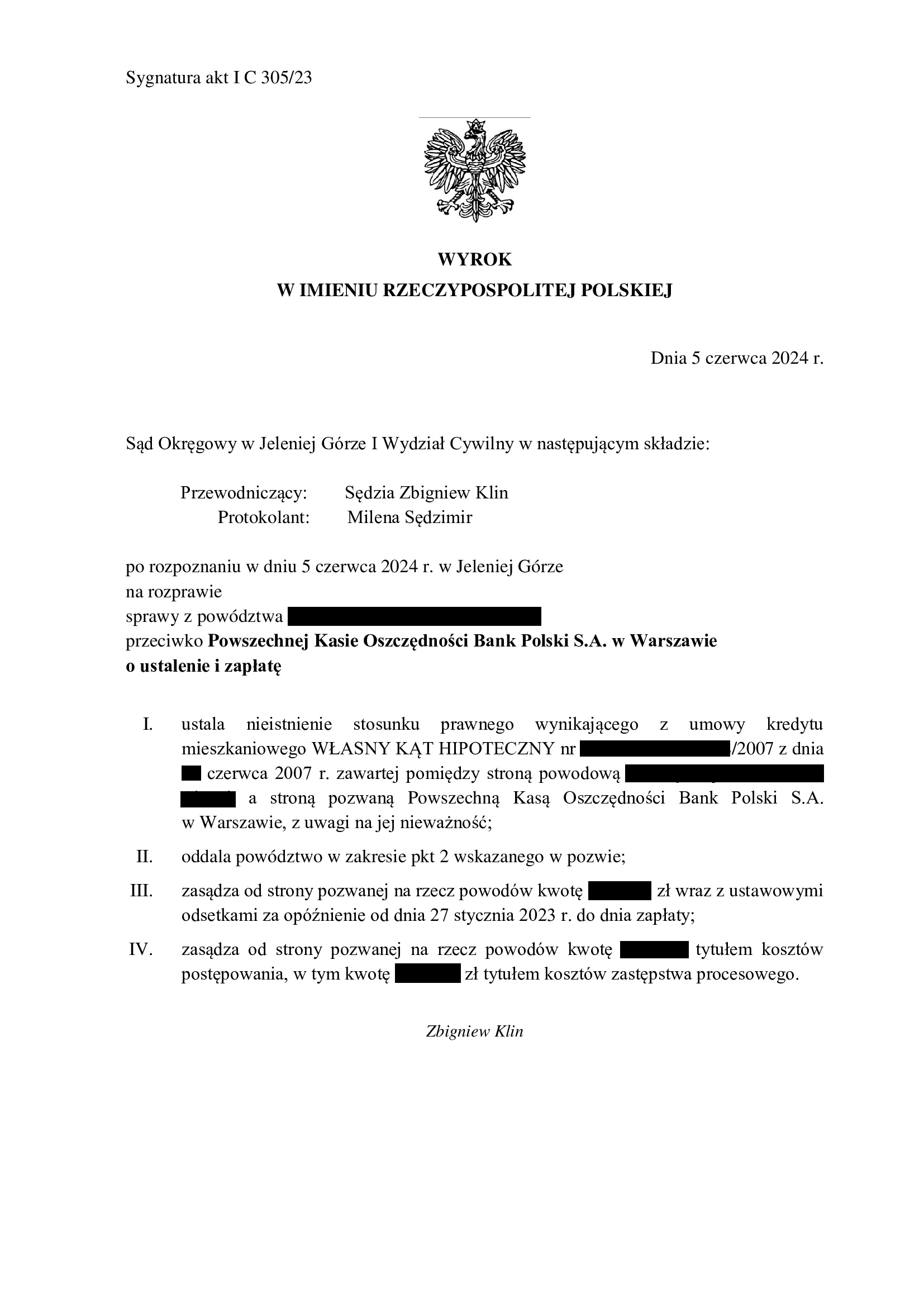 Wyrokiem z dnia 25.02.2026 r., Sąd Okręgowy w Jeleniej Górze (SSO Piotr Nachmann), w sprawie o sygn. akt I C 41/25, ustalił nieistnienie z powodu nieważności umowy kredytu indeksowanego do CHF zawartej w czerwcu 2008 r. z dawnym Getin Bank S.A. DomBank Hipoteczny Oddział w Łodzi i zniósł koszty procesu.