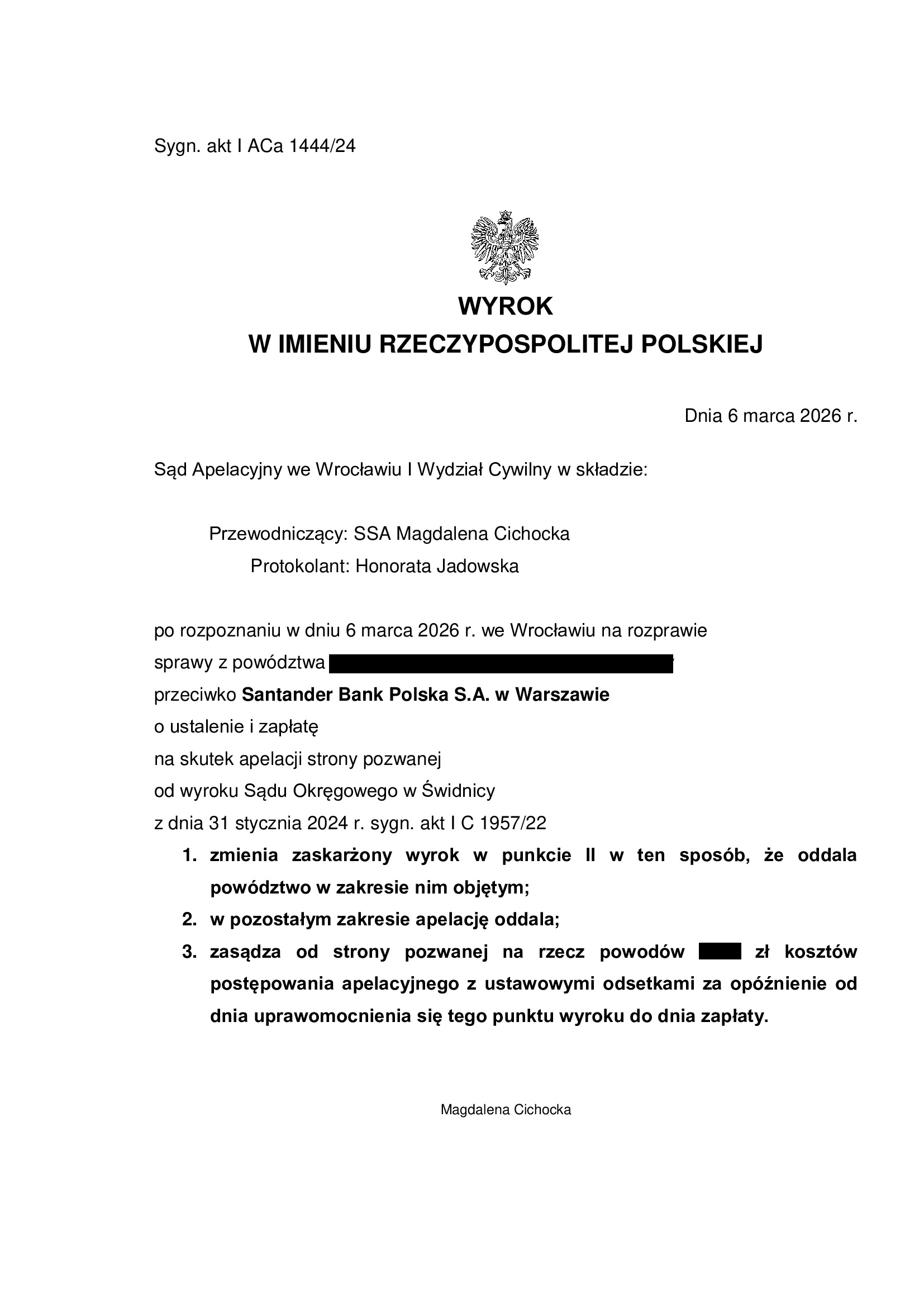 Apelacja banku została oddalona wyrokiem Sądu Apelacyjnego we Wrocławiu z dnia 6.03.2026 r., sygn. I ACa 1444/24.